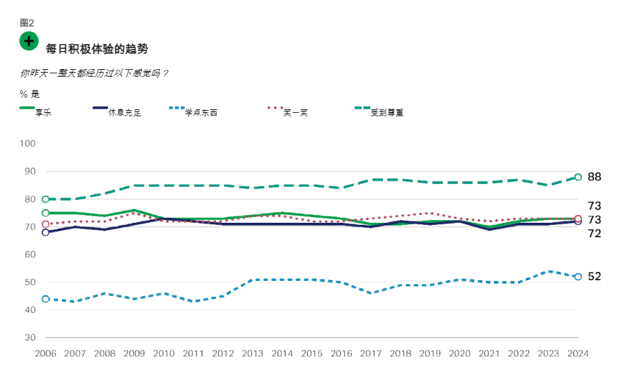 88%的人表示在过去24小时内感受到了他人的尊重,这一比例是盖洛普有记录以来的最高水平之一。感到愉悦开心(73%)与生活满足(73%)的人群占比,均稳定在长期平均水平。72%的受访者称自己休息充足,这一数据在过去十年间基本保持稳定。